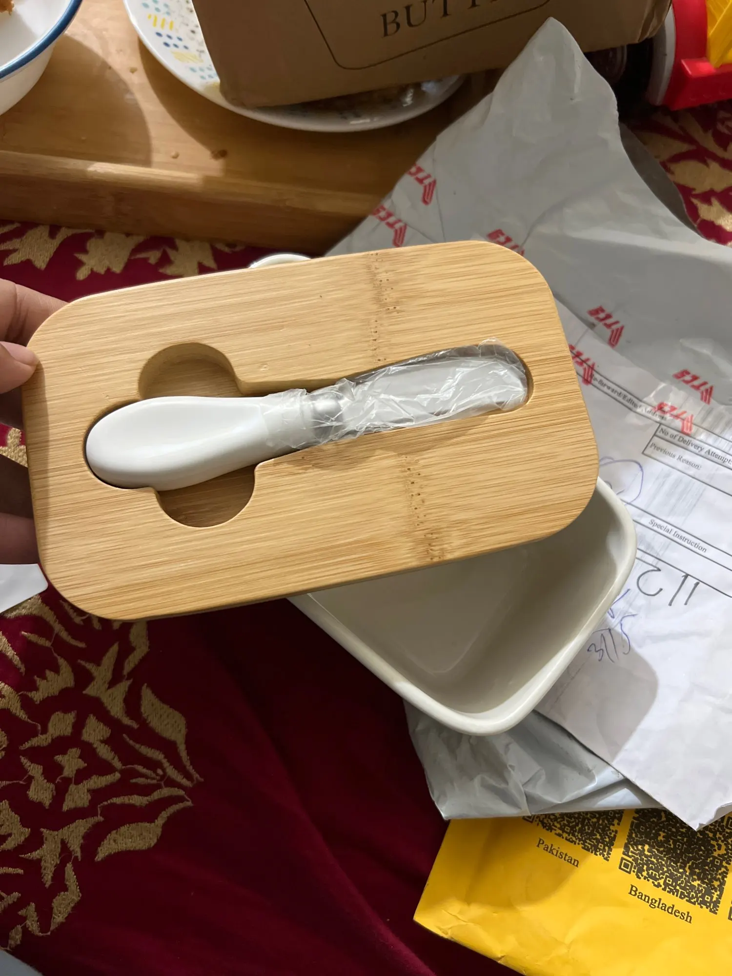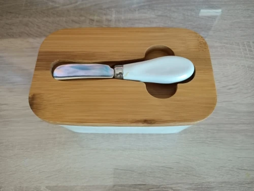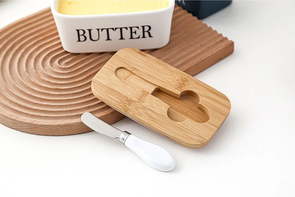 Использование высшего класса фарфора, типа Премиум бессвинцового фарфора. Крышка масла изготовлена из натурального бамбукового материала и ножа из нержавеющей стали 304. Это блюдо для масла безопасно для вашей семьи и окружающей среды.