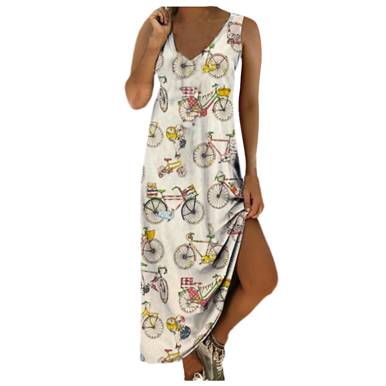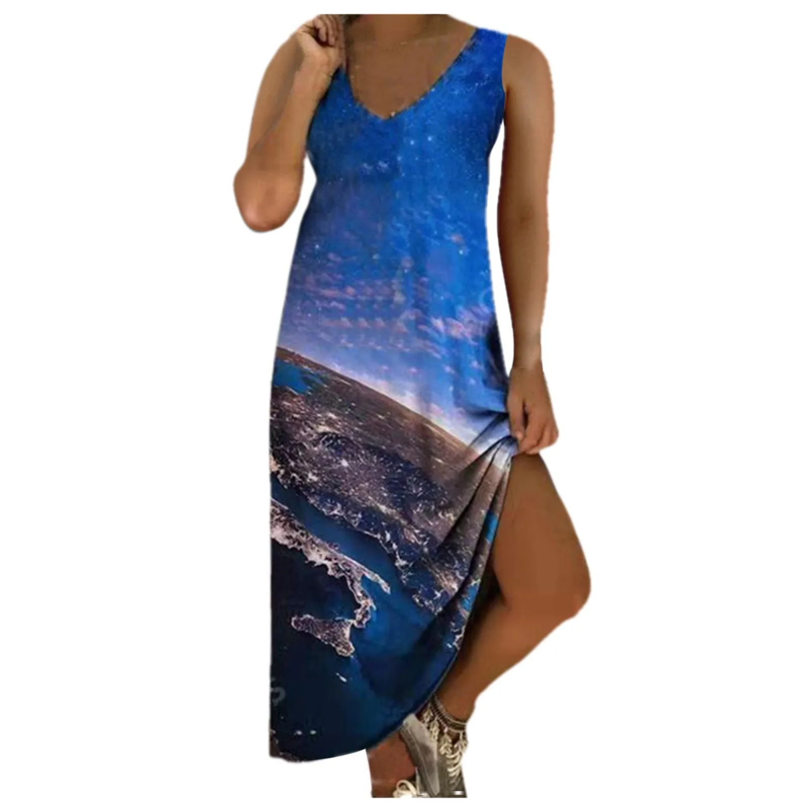 Женское длинное платье с принтом, свободное платье без рукавов с круглым вырезом, повседневное женское платье, платья