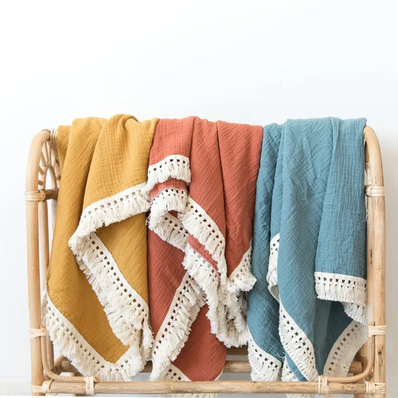 плед одеяло пеленки для новожденных муслиновые пеленки Муслиновые пеленки с кисточками, хлопковые детские одеяла с бахромой, Двухслойное постельное белье для новорожденных, Марлевое банное полотенце для младенцев