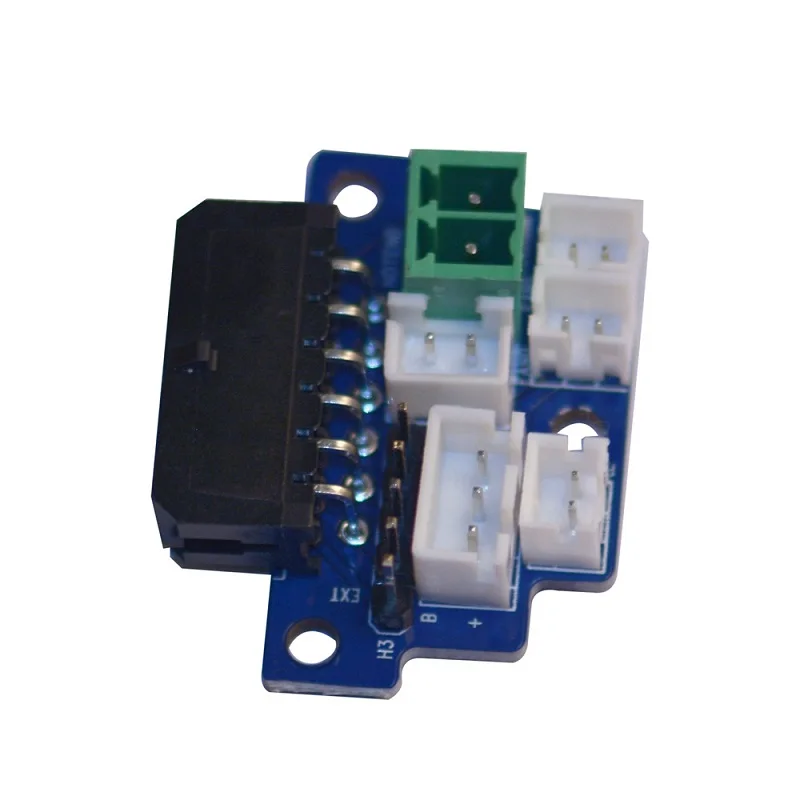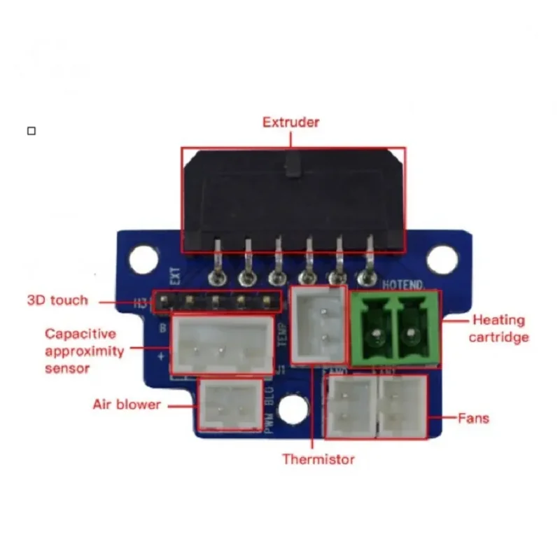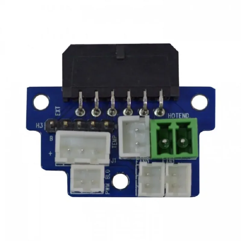 Он поставляется с 8 интерфейсами для подключения экструдера, картриджа нагревателя, термистора, сенсора 3D, емкостного датчика приближения, воздуходувки и двух вентиляторов.