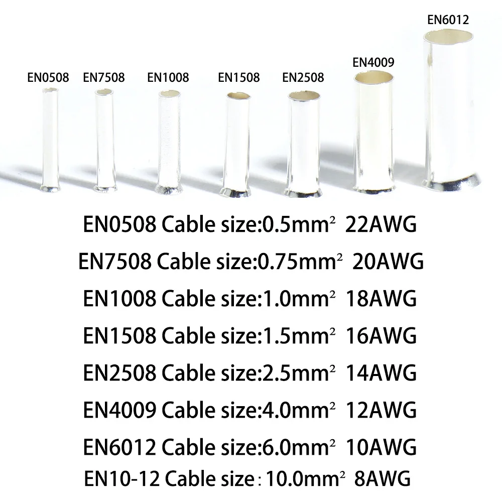 EN7508 размер кабеля: 0,75 мм ² 20AWGEN1008 размер кабеля: 1,0 мм ² 18AWGEN1508 размер кабеля: 1.5мм ² 16AWGEN2508 размер кабеля: 2,5 мм ² 14AWGEN4009 размер кабеля: 4,0 мм ² 12AWGEN6012 размер кабеля: 6,0 мм ² 10AWGEN10-12 размер кабеля: 10,0 мм ² 8AWG