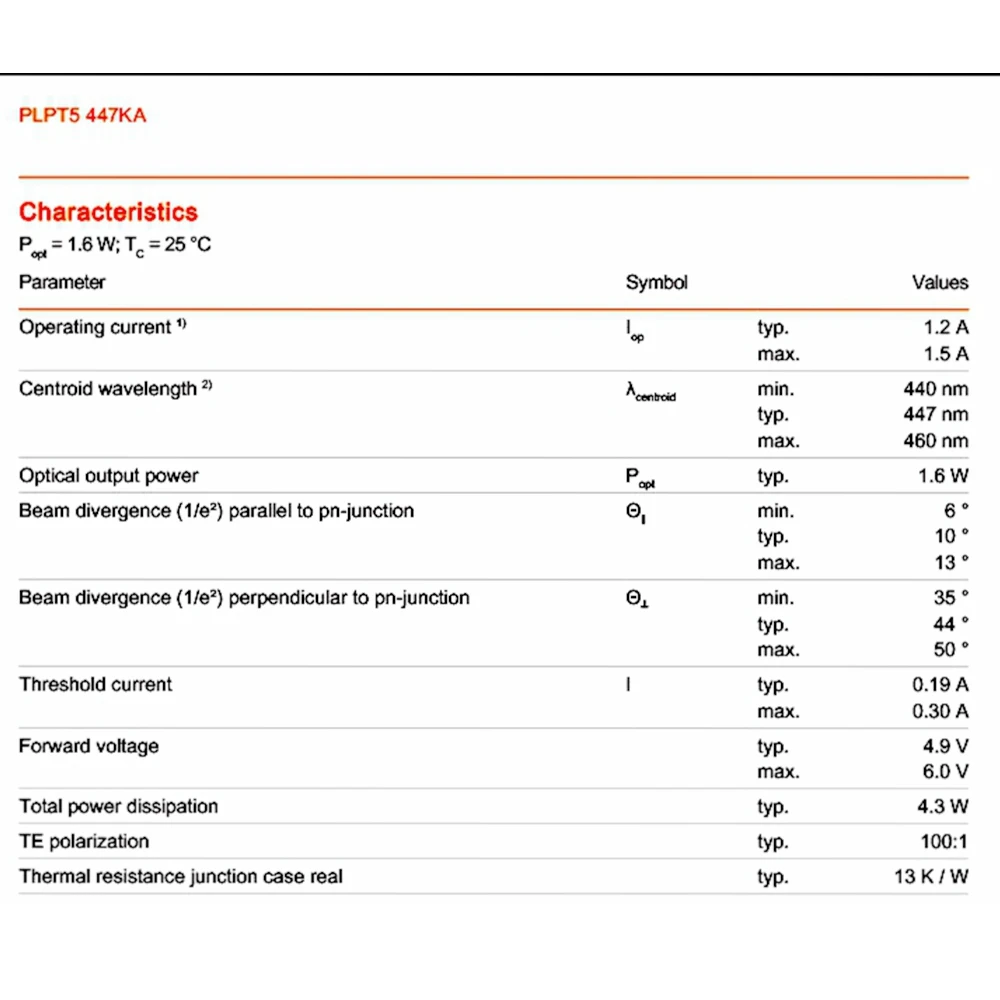 Длина волны: 450нмМощность: 1600 мВтТок: 1200маУпаковка продукта: TO-9 (φ9 мм)Суммарная мощность рассеивания: 4,3 WПоляризация: 100:1Термостойкий распределительный чехол real: 13 K/WРабочая температура: -20 °C ~ + 60 °C