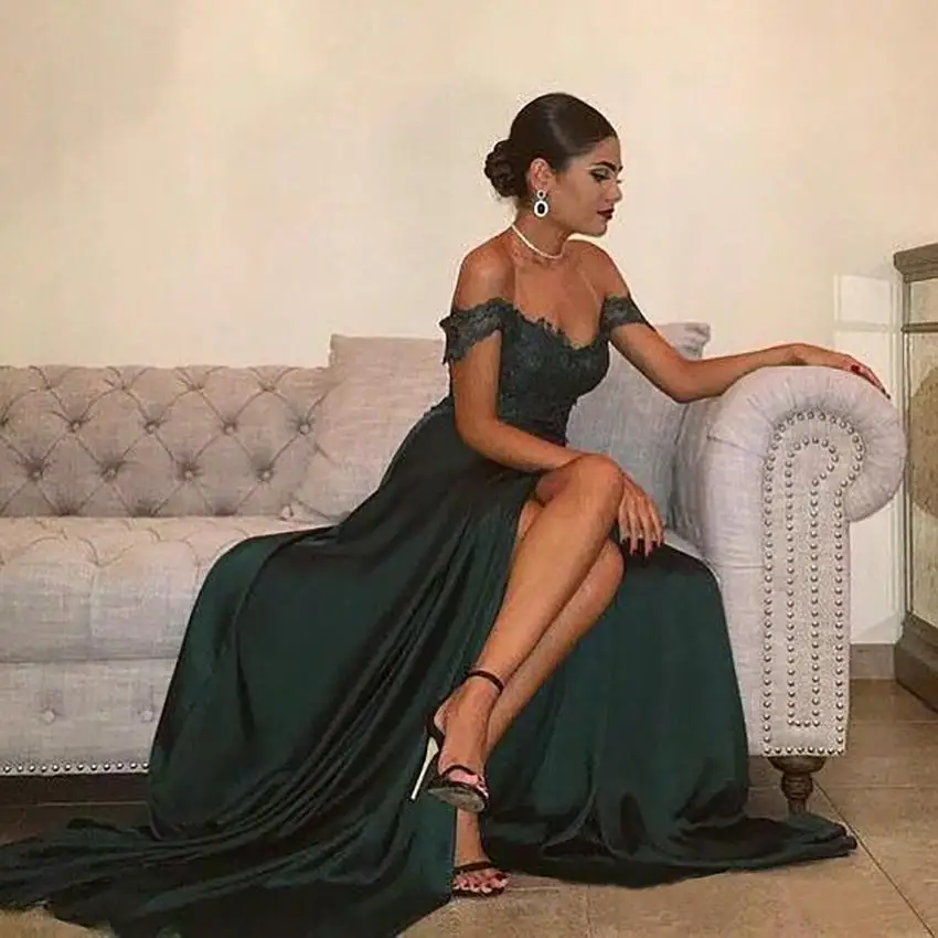 Темно-зеленые вечерние платья, ТРАПЕЦИЕВИДНОЕ Цветочное платье с разрезом сбоку, кружевной топ, сексуальное женское вечернее платье с открытыми плечами, вечерние платья