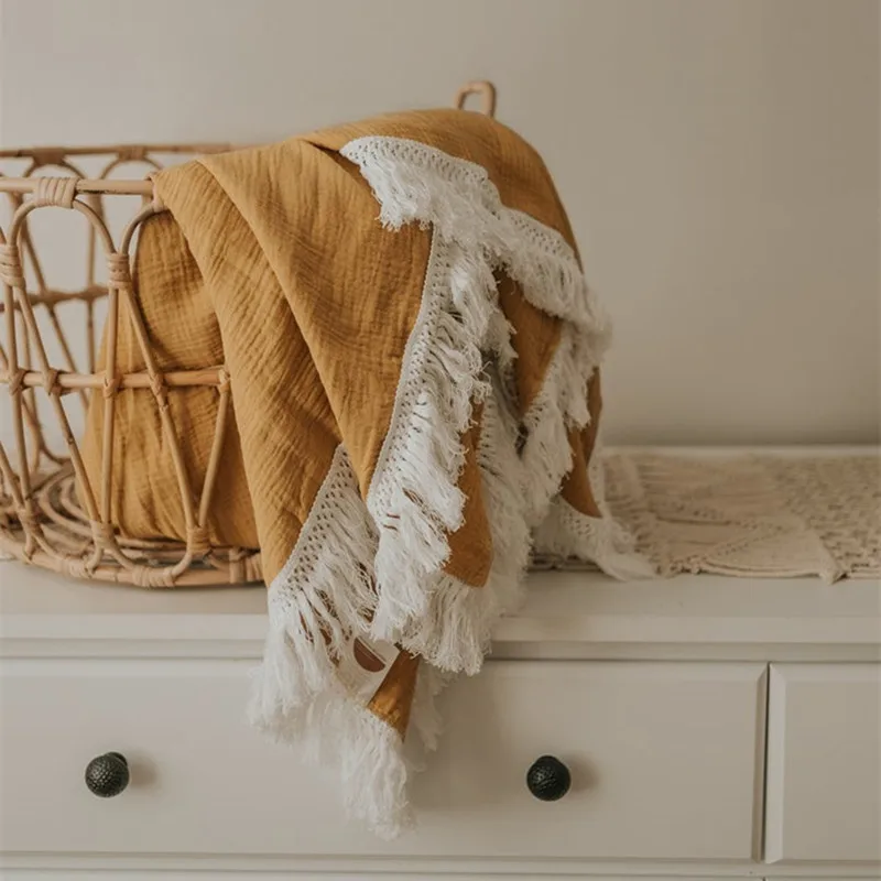 Детское муслиновое одеяло, Пеленальное Одеяло, детское Хлопковое одеяло с кисточками, детское одеяло для новорожденных