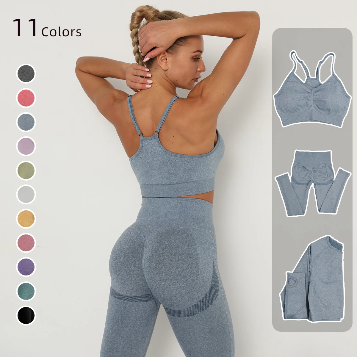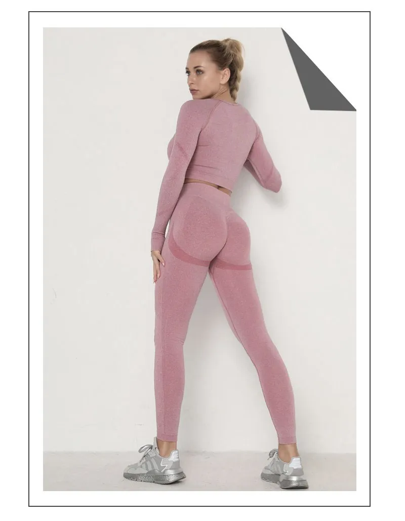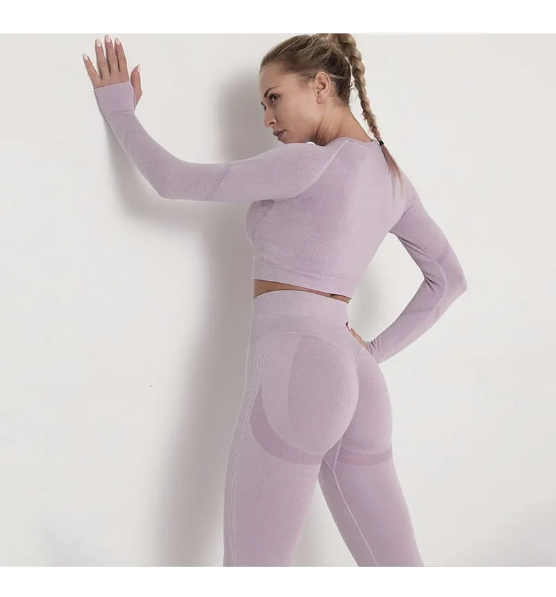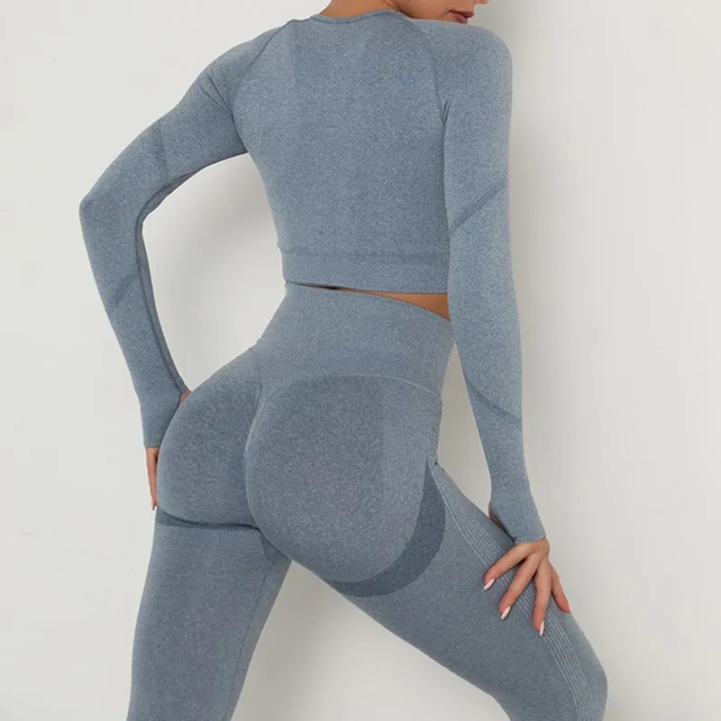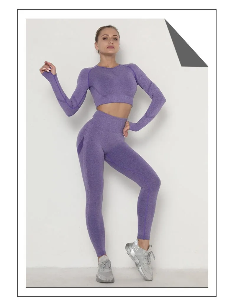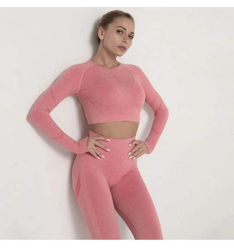 Бесшовный комплект для йоги, Женская Спортивная одежда для тренировок, одежда для тренажерного зала, укороченный топ с длинным рукавом, леггинсы с высокой талией + бюстгальтер, спортивные костюмы