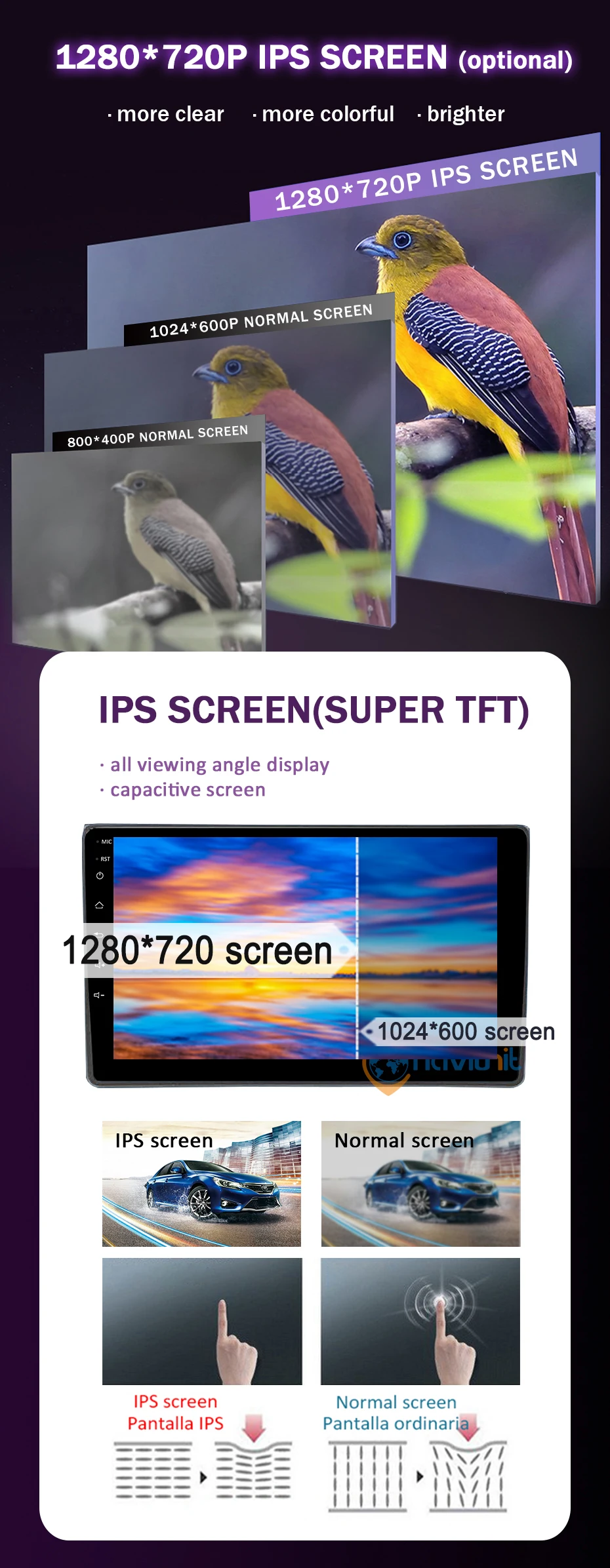 Экран 1280*720P IPSЭто Радио имеет два вида экрана-1024*600P HD экран и 1280*720P супер HD экран. Экран 1280*720 ярче и ярче обычного hd-экрана. Вы можете выбрать тип по вашему желанию.