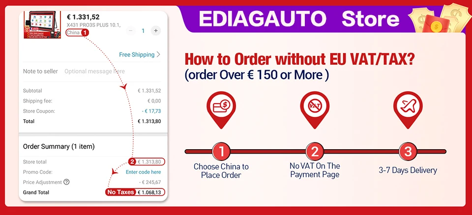 О: 1. Пожалуйста, выберите доставку из Китая. Нет налогового сбора на странице оплаты. Мы отправим вам со склада евро. Срок доставки 3-7 дней.
