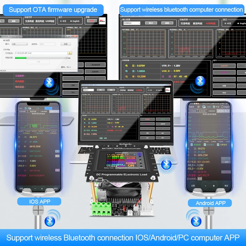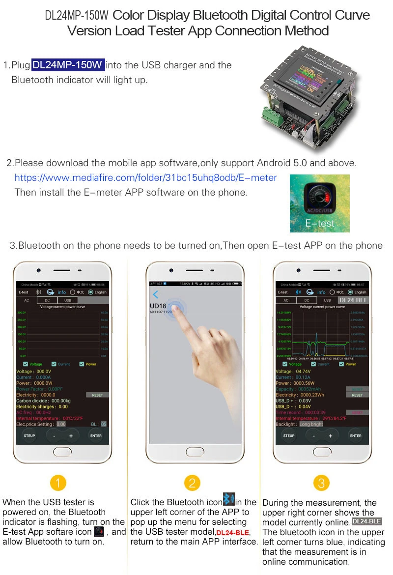 Пожалуйста, найдите E_test в магазине приложений для загрузки и установки, затем нажмите на значок приложения Bluetooth, чтобы открыть программное обеспечение, И затем нажмите на значок Bluetooth над программным обеспечением, чтобы войти в DL24-BLE выбора для подключения, вы можете достичь дистанционного беспроводного пульта дистанционного управления и функции измерения мобильного телефона, Состояние разряда можно посмотреть в любое время на мобильном телефоне, видна различная Очистка данных, кривая напряжения и тока разряда и т. Д.