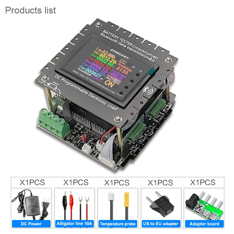1.DL24MP150W цветной дисплей Bluetooth цифровое управление кривая версия нагрузки Tesr x12.DC12V 1A блок питания x13. Мужские и женские винты X5 наборы4. Датчик температуры x15. Красный и черный одиночная линия крокодил клип линия x16. Адаптер стандарта США в ЕС x1