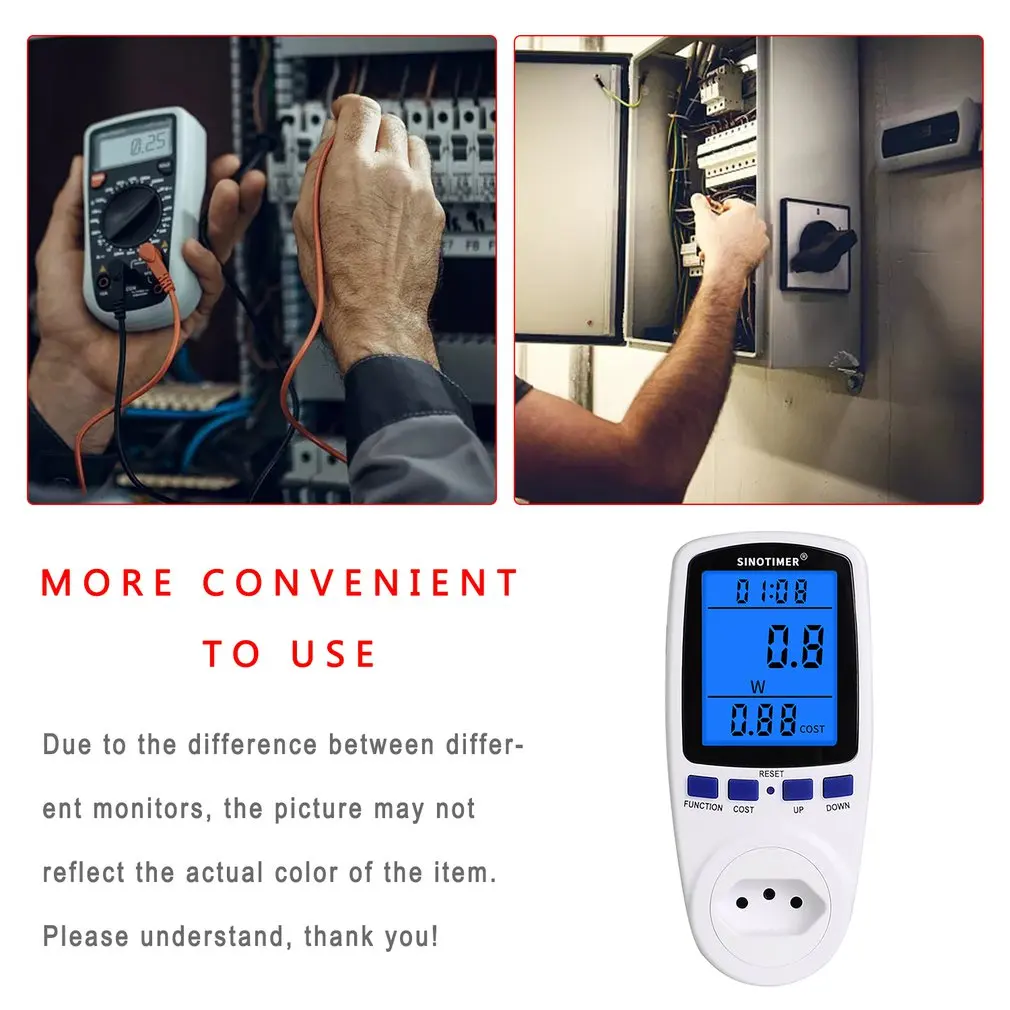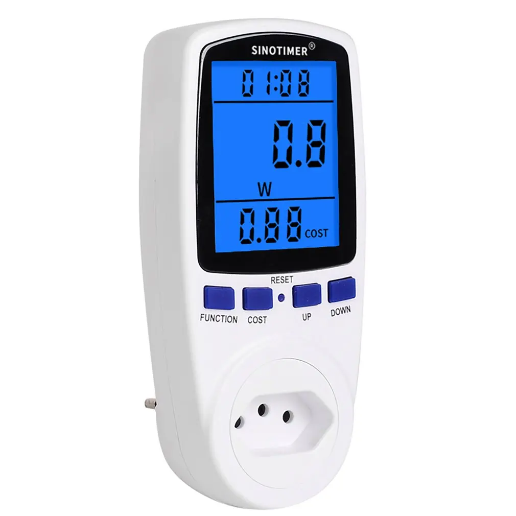 Измерьте различные параметры и функцию защиты от перегрузки: мощность (Вт), энергия (кВтч), вольт, ампер, герц, коэффициент мощности и Максимальная мощность (Вт), время, дни.
