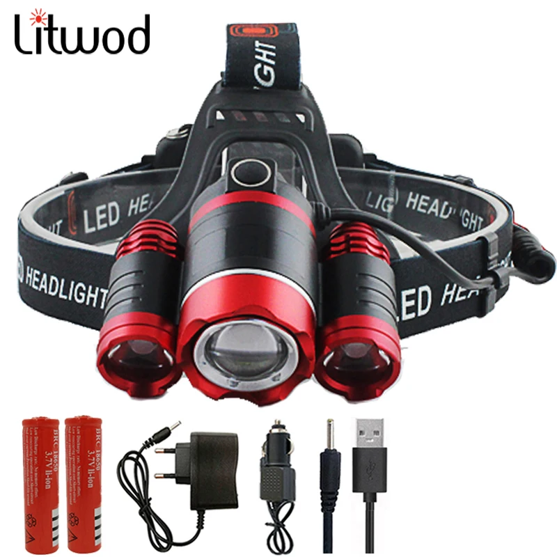 Суперъяркая светодиодная фара T6, масштабируемый налобный фонарь, головной фонарик, фонарик, лампа + 2 батареи 18650 + зарядное устройство ACавтомобильUSB Litwod