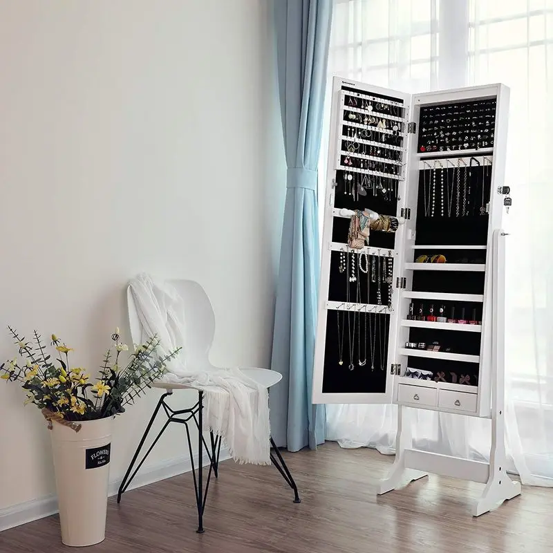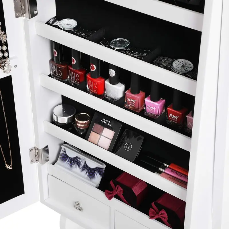 Гениальный дизайн: дизайн интегрирует коробку ювелирных изделий и зеркало в одно целое тело, что более удобно. Угол наклона зеркала регулируется в зависимости от высоты. Он изготовлен из двп, который очень прочный. С рисунком белого цвета, он более изящный и элегантный