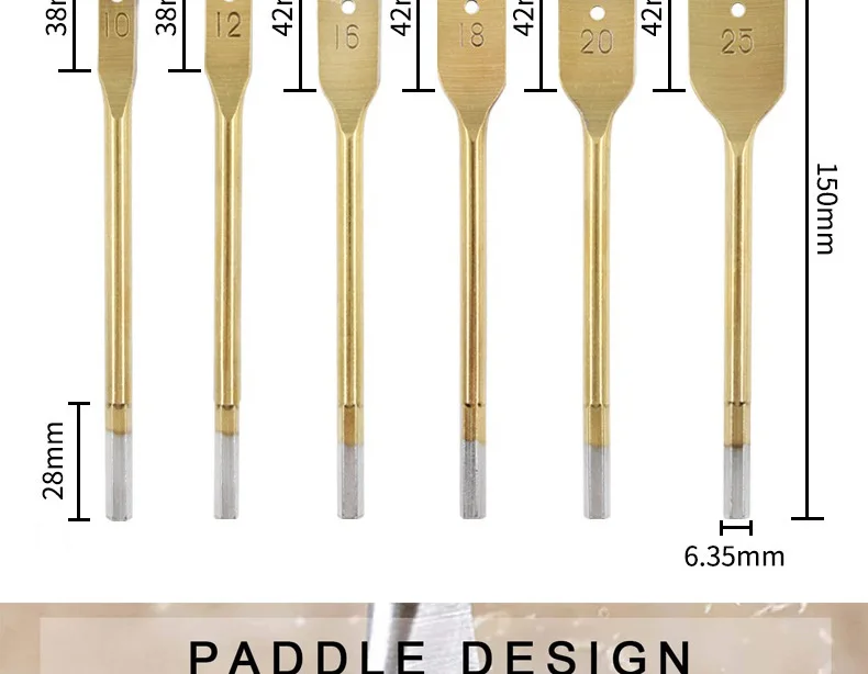 6 шт., плоские сверла с титановым покрытием и шестигранным хвостовиком, 101216182025 мм