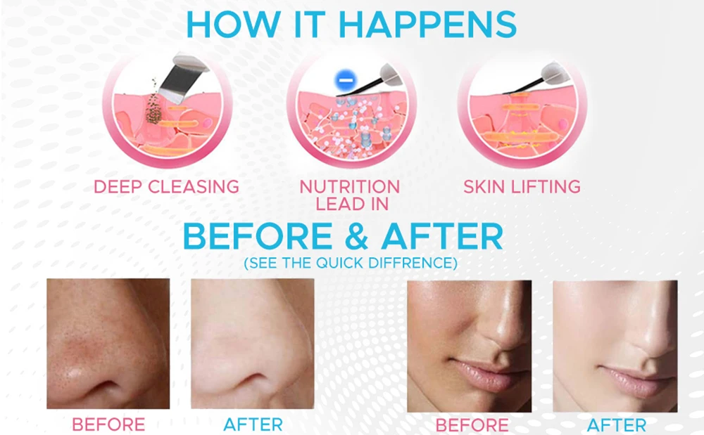 -Несколько функций: Этот скруббер работает через ультразвуковую вибрацию, которая может углубиться в поры, удалить грязь, старение клеток и корней. Он может эффективно удалять акне, угри, устранять морщины и кютис laxa, ускорять кровообращение, способствовать метаболизму, разложению меланина и рассеивать пятна. -Три режима работы: Одно нажатие указывает на режим очищения, двойное нажатие переходит в режим увлажнения, а тройное нажатие указывает на режим подъема. -Мягкий рабочий процесс: отсутствие боли или раздражения, покупка без риска, Высокоэффективная Личная служба поддержки клиентов. -Ультразвуковая Вибрация 24000 Гц в секунду. Импорт аниона облегчает удаление грязи с вашей кожи и проникает в питательный раствор. -Перезаряжаемый: при первом использовании, пожалуйста, заряжайте его не менее 5 часов. Затем для следующей зарядки требуется всего 3 часа. Он может продолжать использовать в течение 2 часов после полной зарядки. При использовании 2 - 3 раза в неделю вы становитесь еще красивее. -Примечания: он лучше работает вместе с продуктами по уходу за кожей, такими как Глубокое Очищающее Масло, очищающая пена, тонер, массажный крем, эфирное масло, эссенционный крем.