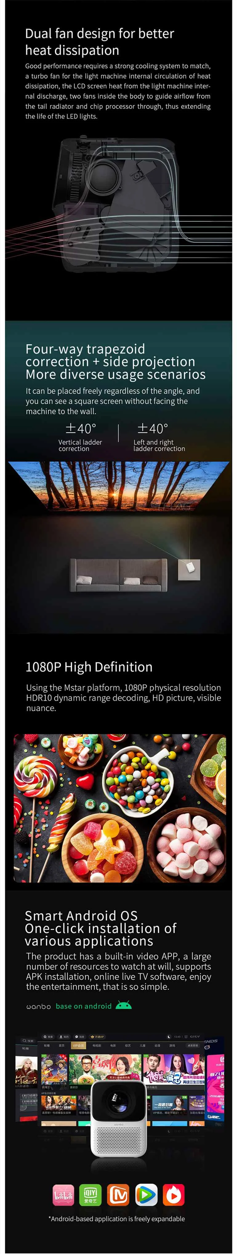 Native physical разрешение 1920*1080 пикселей с 200 Ansi люменПродукт поддерживает более десяти международных языковВстроенная смарт-система ОС Android с YouTube и NetflixЧетырехполосная электронная коррекция keystoneВстроенный экран литье приложение мобильный телефон может подключаться к проекторуВстроенное офисное программное обеспечение, встреча и работа