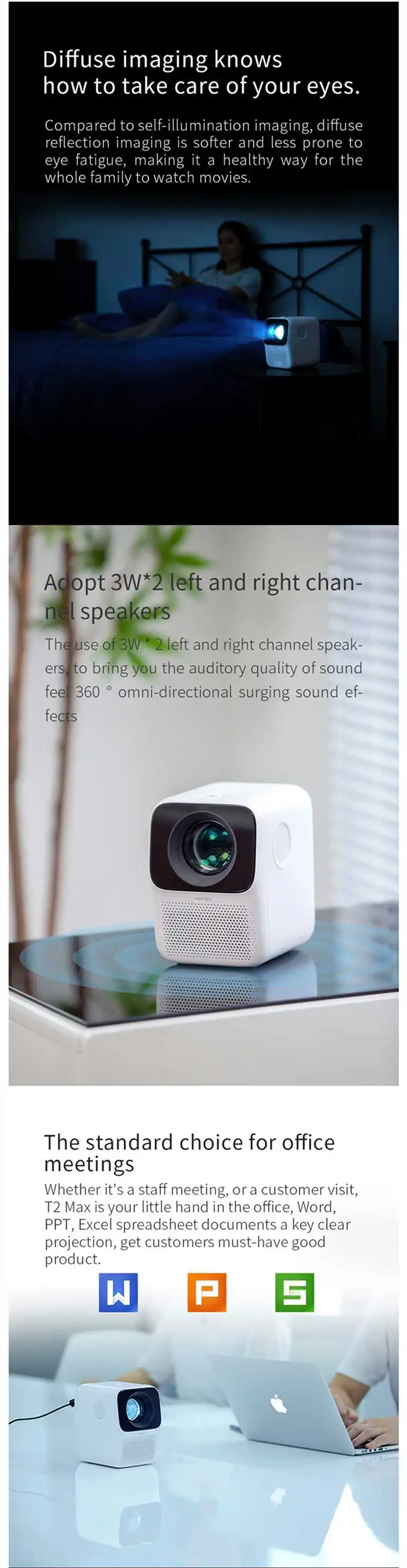 Этот продукт-Wanbo, бренд Xiaomi Eco-chain, и на прилагаемой упаковке нет бренда Xiaomi. Спасибо за пониманиеВ: я включил его, но нет экрана?О: Пожалуйста, проверьте, подключен ли источник питания, нажмите кнопку, чтобы включить, система должна работать в течение 2 секунд, чтобы включить светильник, пожалуйста, не нажимайте кнопку питания непрерывно.В: как подключиться к интернету?О: Загрузите в настройки, найдите соединение wifi, проверьте, хорошая ли сеть, и подключите к беспроводной сети.В: какое отношение к броску?A: коэффициент броска: 1,35: 1, и диапазон проекционного размера: 40-120 дюймов. Рекомендуемый размер проекции составляет 50-80 дюймов.В: какое оборудование поддерживается для подключения проектора к литому экрану?A: Поддержка мобильных телефонов, планшетов, ноутбуков, выключателей, PS4, ТВ-приставок и т. д. для проекции экрана.В: Поддерживаете ли вы Подключение аудио оборудования?A: T2Max, поддерживает проводные динамики, проводные гарнитуры, bluetooth-динамики и bluetooth-гарнитуры. После того, как аудио устройство подключено, аудиоустройстваВ: Каковы Методы проекции проектора?О: T2Max имеет два способа использования проекции:1) непосредственно включите и подключите к WIFI, вы можете использовать встроенное приложение для просмотра фильма.2) Подключение мобильных телефонов, планшетов, ноутбуков, выключателей, PS4, ТВ-приставок и т. д. для проекции экрана.Вопрос: какая проекция содержимого поддерживается?О: Поддержка видео, фотографий, документов и мобильных игр, которые будут проектироваться и смотреть.В: картинка не ясна, как настроить фокус?О: поверните верхнее зубчатое кольцо, чтобы отрегулировать фокусировку проекции До четкой точки. Когда размер фокусировки регулируется по максимуму влево и вправо, пожалуйста, не начинайте вращать и регулировать.В: почему пульт дистанционного управления не чувствителен?Ответ: приемник дистанционного управления расположен перед проектором. Для дистанционного управления направьте пульт дистанционного управления на проекционный экран.Вопрос: Есть ли какая-либо значительная разница между проекционным эффектом в течение дня и ночи?О: Да, это лучше, чем смотреть его ночью.В: есть ли встроенный аккумулятор?О: Этот продукт не имеет встроенного аккумулятора и должен быть подключен к батарее в течение срока службы.