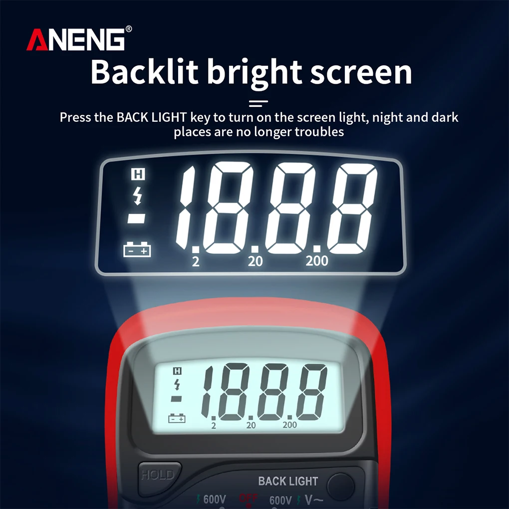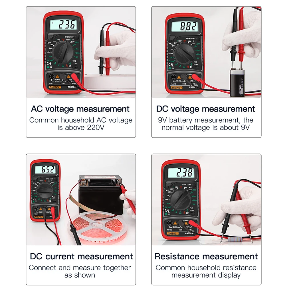 Описание:Цифровой дисплей: Этот мультиметр разработан с подсветкой экрана, вы можете читать данные четко и легко, что делает вашу работу более удобной.Многофункциональный: этот тип детектора может использоваться для проверки напряжения, тока, сопротивления, температуры, триода, диода и звука, достаточно для удовлетворения ваших различных потребностей.Подсчет дисплея: максимальный дисплей может быть до 1999 подсчетов, и тестер может держать данные легко, избегая проблем для вас.Портативный: разработан с небольшим размером и легким, этот детектор может быть легко переносится, не занимая так много места, подходит для домашнего и профессионального использования.Долговечность: вольтметр разработан с защитой от перегрузки, и он питается от аккумулятора 9 В (не входит в комплект), вам просто нужно изменить батарею после использования.Спецификация:Цвет: красный, желтый, зеленый, синий.Размер: экран: прибл. 45x1 8 мм/1,77x0,7дюйма.Напряжение постоянного тока: 200мВ-2-20-2000-600в ± 0.5%.Напряжение переменного тока: 200V - 600V ± 1,0%.Ток постоянного тока: 2 м-20 м-200 м-10A + 1.8%.Сопротивление: 200kH 200-2-20k, 2kmΩ ± 1.0%.Температура: термопара типа K, -20 ℃ ~ 1300 ℃(± 3%).Триод: PNP/NPN Триод hFE.Диод: Да.Входное сопротивление: 1mΩ.Батарея элемент питания: 9V 6F22 (не прилагаются).Макс. Дисплей: 1999 отсчетов (3 полужк-дисплея).Голос: Да.Хранение данных: Да.Подсветка: Да.Примечание:В связи с неточной передачей цвета на экране монитора фактический цвет товара может немного отличаться от цвета на изображении.Пожалуйста, допускайте небольшое отклонение в данных измерений и убедитесь, что вы не возражаете перед заказом.Посылка включает в себя:1 шт. мультиметр (с 2 зондами, 1 шт. инструкция).
