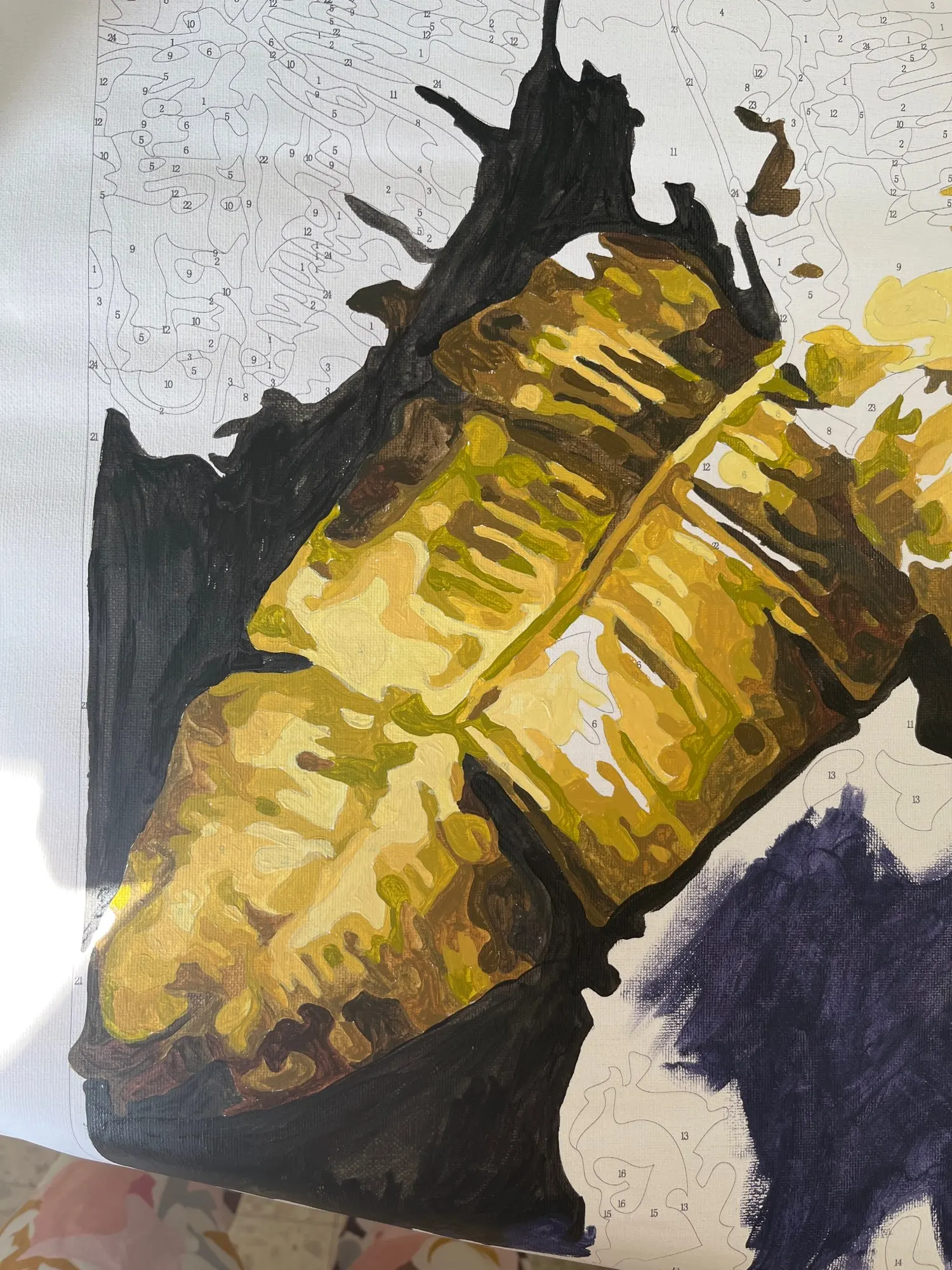 Товар пришёл быстро и хорошо упакован. Есть краски по номерам, 3 кисточки ( одна 5-6 мм, другие 2 тонкие) и само полотно для раскраски. Всё идеально, сиди и рисуй. Одно но! Золотых красок там нет, есть жёлтые, оливковые,коричневые тона, но золотом и не пахнет…. Вместо синего - основной цвет фиолетовый. Кому не принципиально, подойдёт…. Я немного расстроилась, т.к. не подходит к общей палитре помещения где планировала повесить картину. Буду покупать ещё у этого продавца, только вот это как пальцем в небо тыкать чтоб найти нужные тона… как это решить, ещё не придумала….
