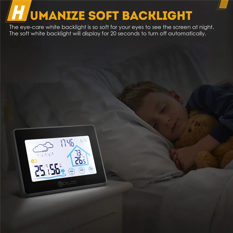 Беспроводная сенсорная Метеостанция Digoo DG-TH8380, комнатный и уличный датчик прогноза, термометр, гигрометр, метр, календарь, подсветка
