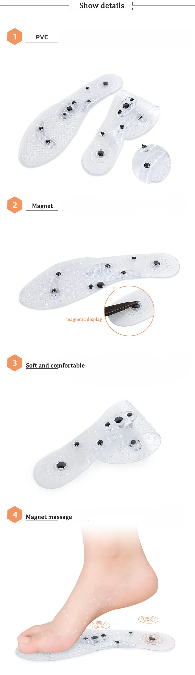 Описание продуктаУдобный массажный эффектМногие массажные точки эффективно массируют ногиМагнитный массаж для ног способствует циркуляции кровиУменьшает мышечную боль и боль, снимает стрессПредотвращает старение, укрепляет здоровье и защищает от болезниДля женщин размер: длина 26,5См, Для мужчин размер: длина 28,5СмМожет быть адаптирован в соответствии с длиной стопыПримечание:Если магнитные шарики на магнитной стельке опускаются, это нормально и могут быть установлены и использованы, не влияя на нормальный эффект использования.Посылка:1 пара магнитной стельки
