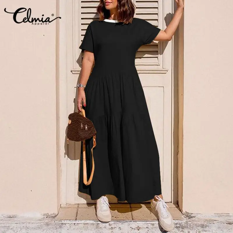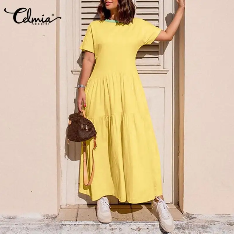 Повседневный Длинный Сарафан Celmia с коротким рукавом 2022, модное женское платье с оборками, летнее цветное Макси-платье большого размера в стиле пэчворк для пляжа