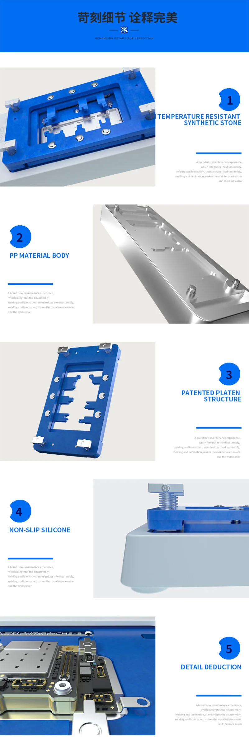 Интеллектуальная материнская плата Mijing CH5, многослойная распашная платформа для iPhone X/XS/XSMAX + 12pro max PCB Teardown, MJ CH5, материнская плата для iphone, предварительно разогревающая отделяющие инструменты для iPhone X Xs Xsmax. MJ CH5 предварительно нагревающий паз для iphone X XS XS-MAX CH5-B C предварительно нагревающий паз для iphone11-11PROMAX MJ CH5-E предварительно нагревающий паз для iphoneE IP12-12PROMAX Форма не включает паяльную станцию предварительного нагрева (необходимо приобретать отдельно) Спецификация: Бренд: MiJing-Китай Посылка Вес: 1,0 кг Напряжение: 100-250 В Характеристика: -Точное позиционирование, точная температура, быстрое повышение температуры, нескользящее увеличение веса, Температура цифрового дисплея, умный сон 15 минут, экстремальное повышение скорости 183 ° три минуты, быстрое расслоение, безопасная разборка, нет повреждений материнской платы.