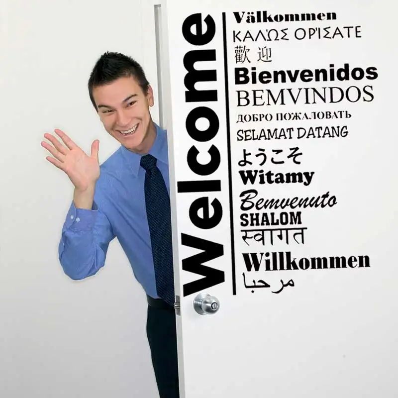 Виниловые наклейки на стену с надписью Добро пожаловать на нескольких языках, чтобы приветствовать клиентов, художественные наклейки на входе в офис
