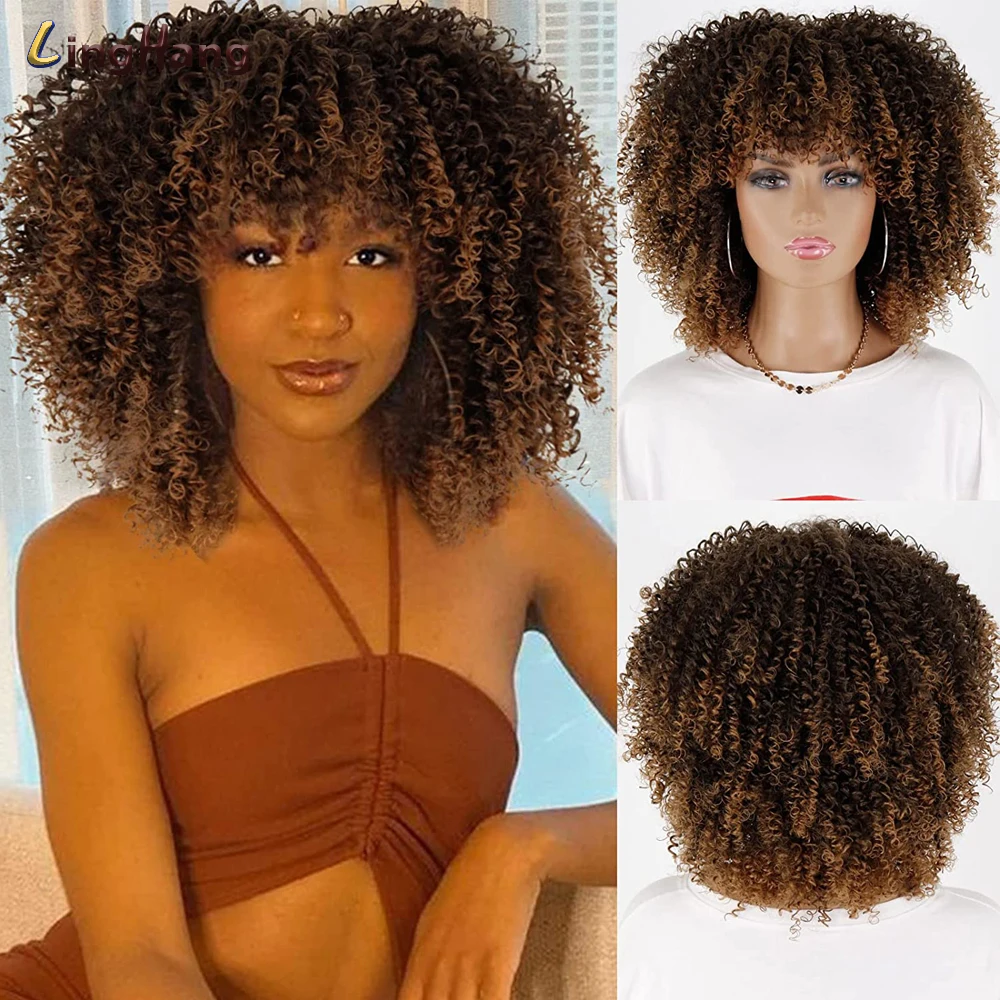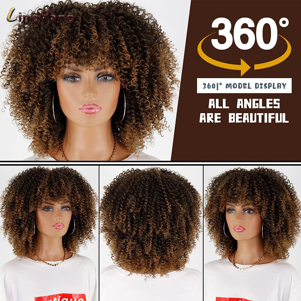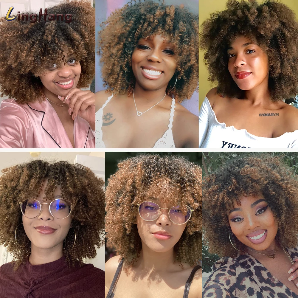 LINGHANG короткие волосы афро кудрявые вьющиеся парики с челкой для чернокожих женщин африканский синтетический омбер безклеевые Косплей парики