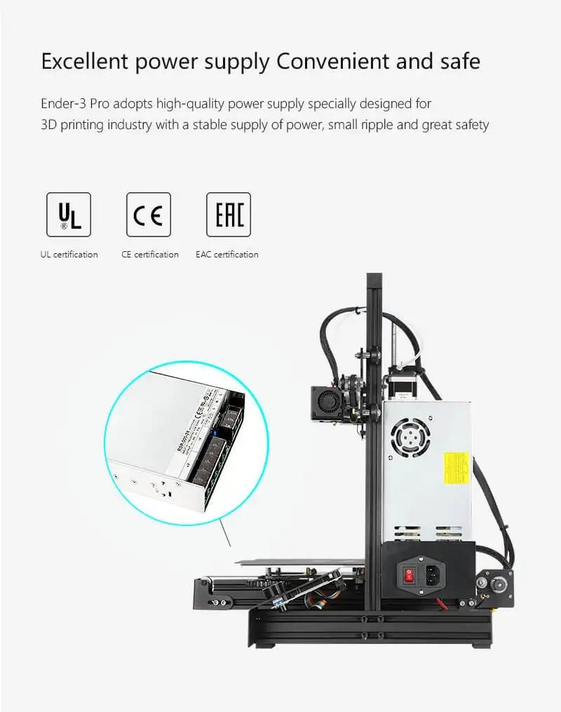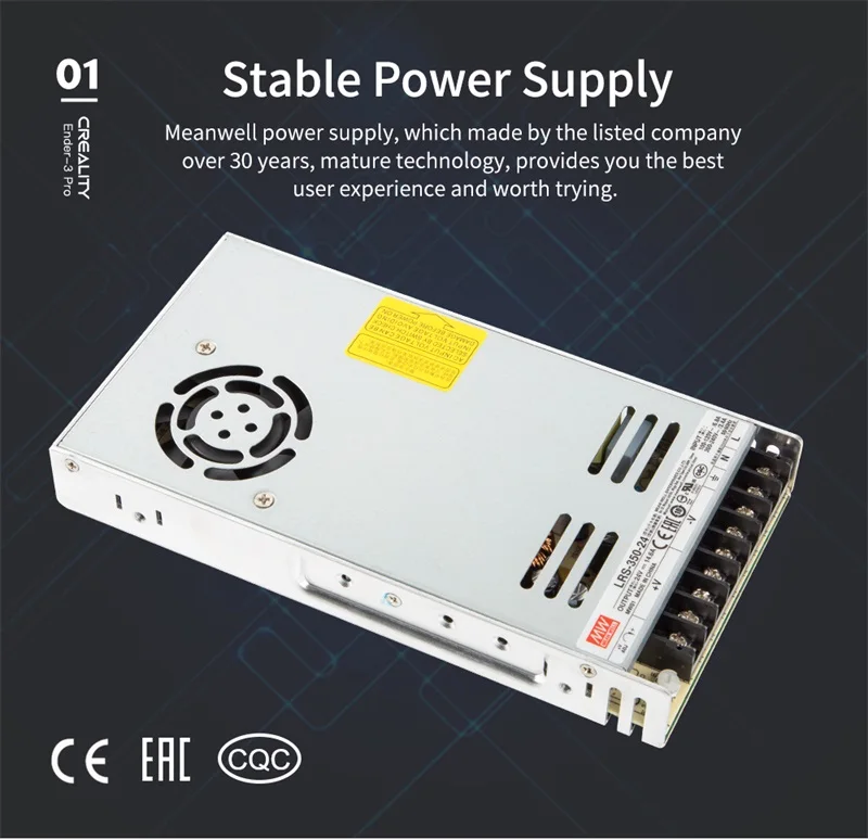 【MeanWell источник питания 】 мы используем MeanWell источник питания, который производится указанной компанией с развитой технологией, и он отвечает всем потребностям быстрого нагрева и длительного 3d-печати. Принтер защищен своим источником питания от шипов напряжения и отключений питания. При потере электрической энергии отпечатки могут быть восстановлены с последнего слоя, что экономит время и сокращает отходы.