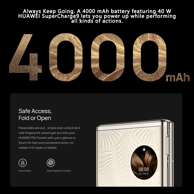 Коды доступа выключены... разблокировка лица и боковая разблокировка отпечатков пальцев доставят вас в карман HUAWEI P50 с помощью одного взгляда или прикосновения для быстрого и удобного входа, независимо от того, открывается ли он или сложен.