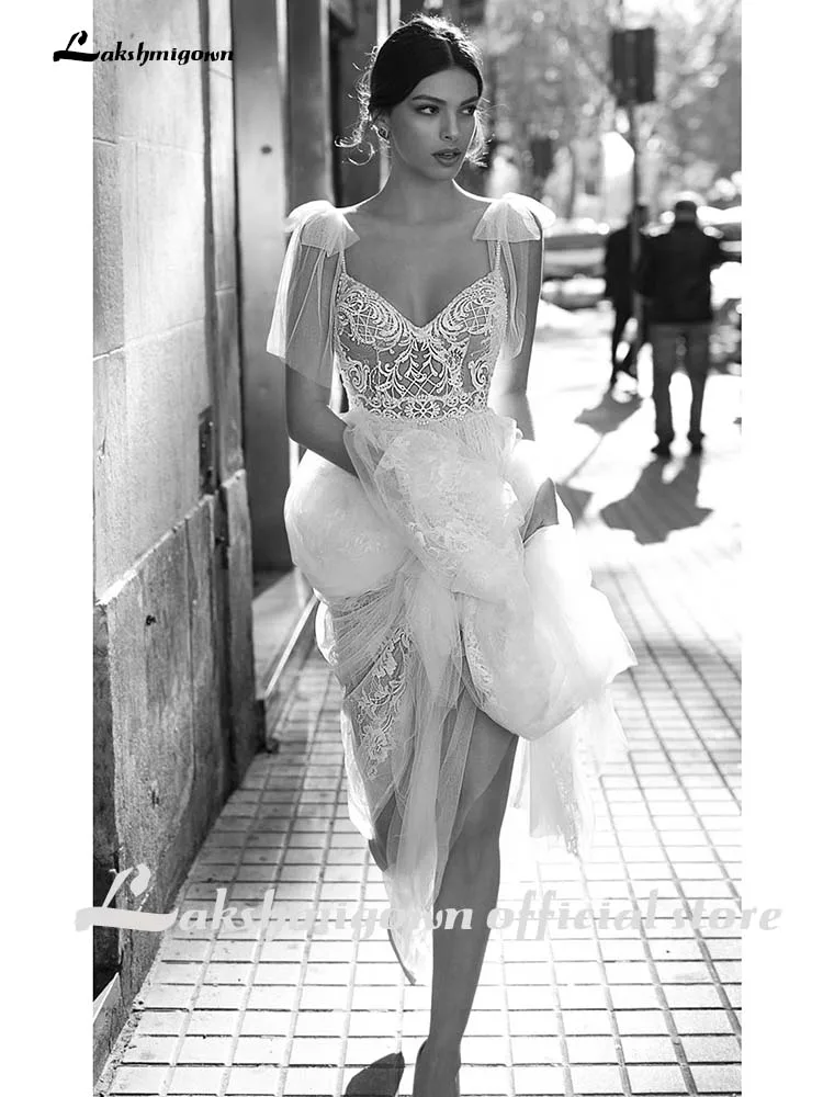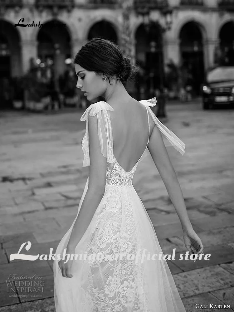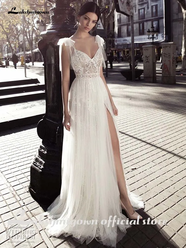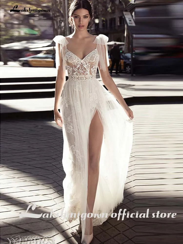 Свадебное платье с высоким разрезом, с открытой спиной, в богемном стиле, сексуальное кружевное платье на бретельках, свадебное платье с аппликацией, свадебное платье