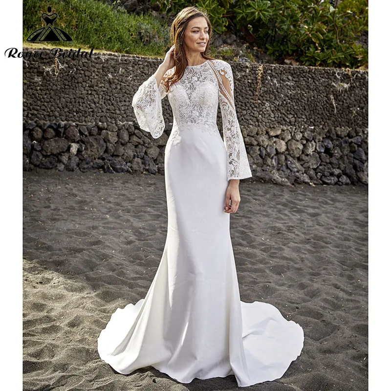 Женское свадебное платье с юбкой-годе It's yiiya, белое атласное платье с длинными расклешенными рукавами, открытой спиной и кружевной аппликацией на лето