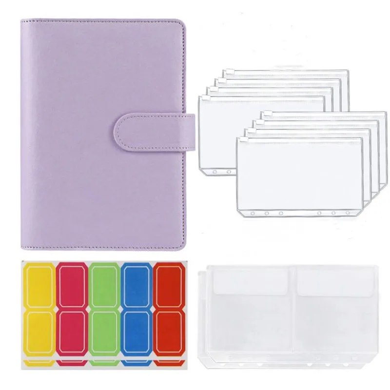В комплект входит: 1 блокнот из искусственной кожи (6 отверстий) + 8 прозрачных сумок на молнии A6 + 2 кармана для купюр A6 + 2 листа цветной бумаги для этикеток