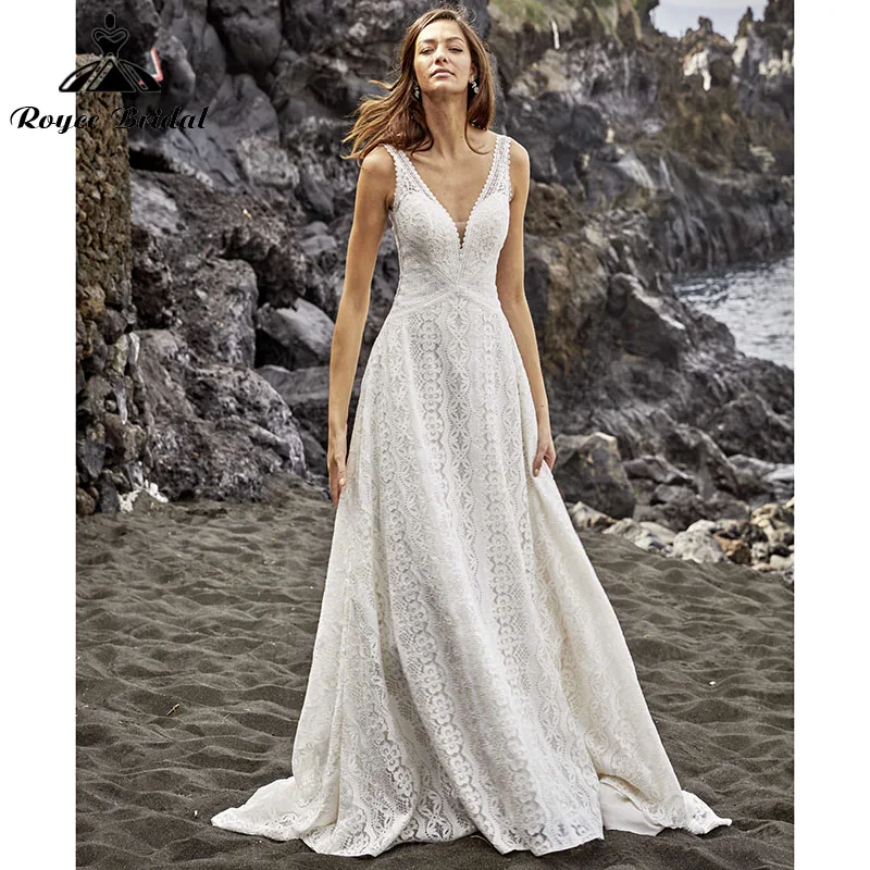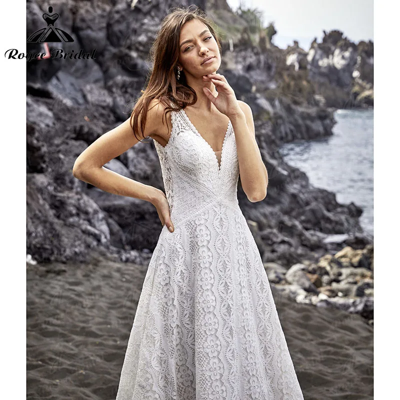Винтажное свадебное платье А-силуэта в стиле бохо, Пляжная майка с V-образным вырезом, кружевное без рукавов, со шлейфом и открытой спиной, vestido de noiva Roycebridal 2022