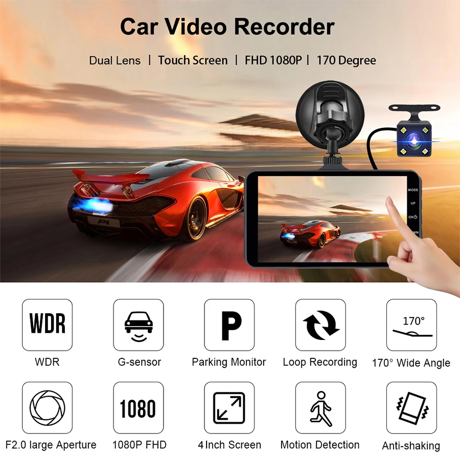 Dashcam 2.5D 4 дюйма IPS чувствительный Автомобильный видеорегистратор с сенсорным экраном 1080P Full HD 170 градусов с двумя объективами петля Запись Камера Авто Регистратор