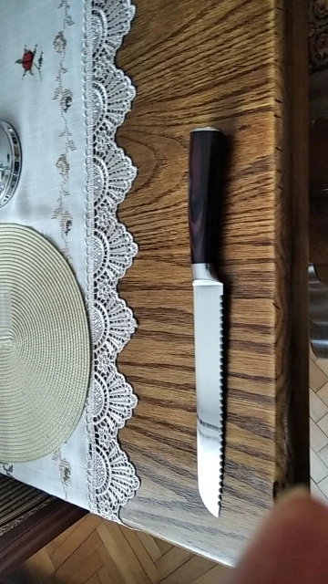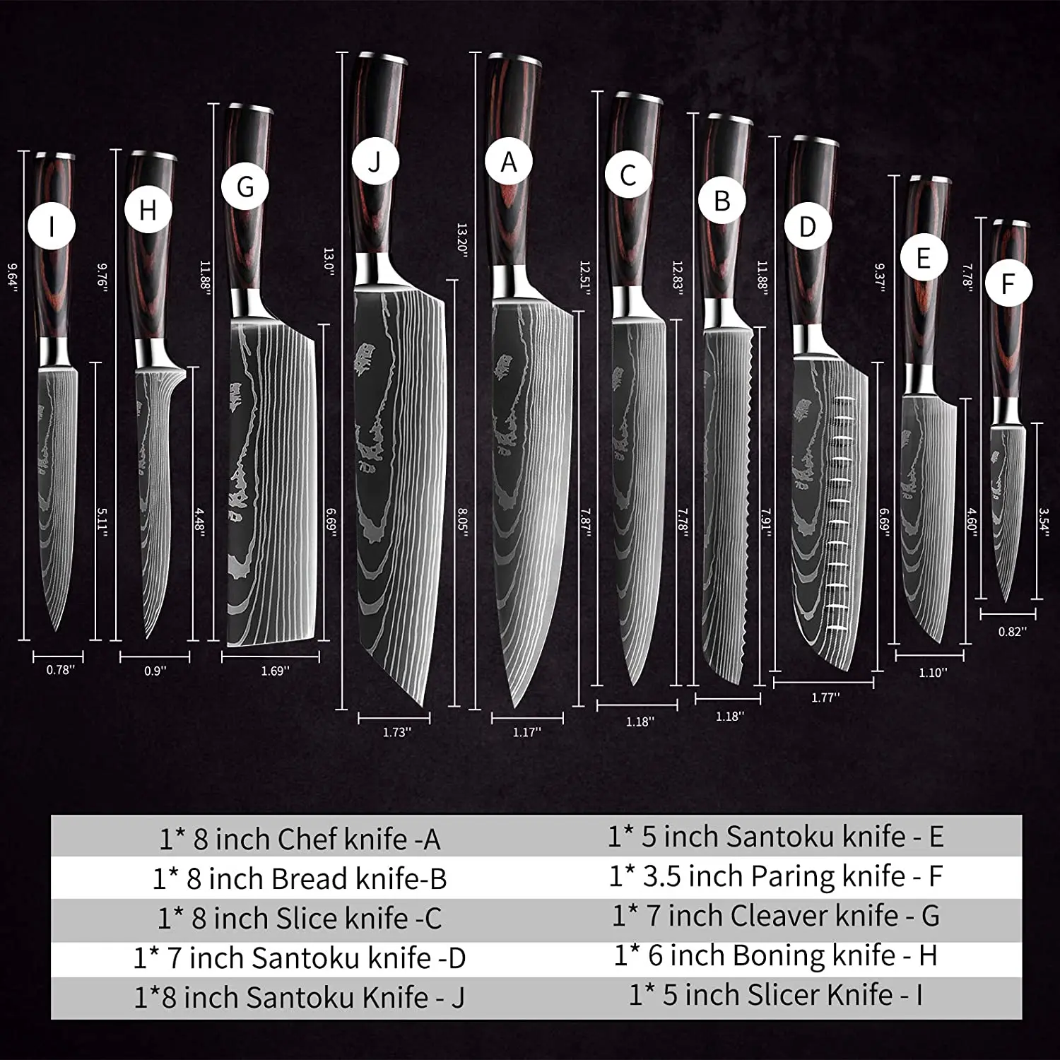 10 шт., набор кухонных ножей в коробке, включает 8 "нож шеф-повара, 8" нож для резки, 5 "нож, 8" нож для хлеба, 7,5 "нож для резки, 7" нож сантоку, 5 "нож сантоку, 7" нож Кливера, 6 "Нож для склеивания и 3,5" нож для очистки овощей. Изгиб лезвия нежен благодаря простой точной резке. Отлично подходит для измельчения, нарезки и нарезки фруктов, мяса, рыбы и овощей на кухне из-за отличной производительности.