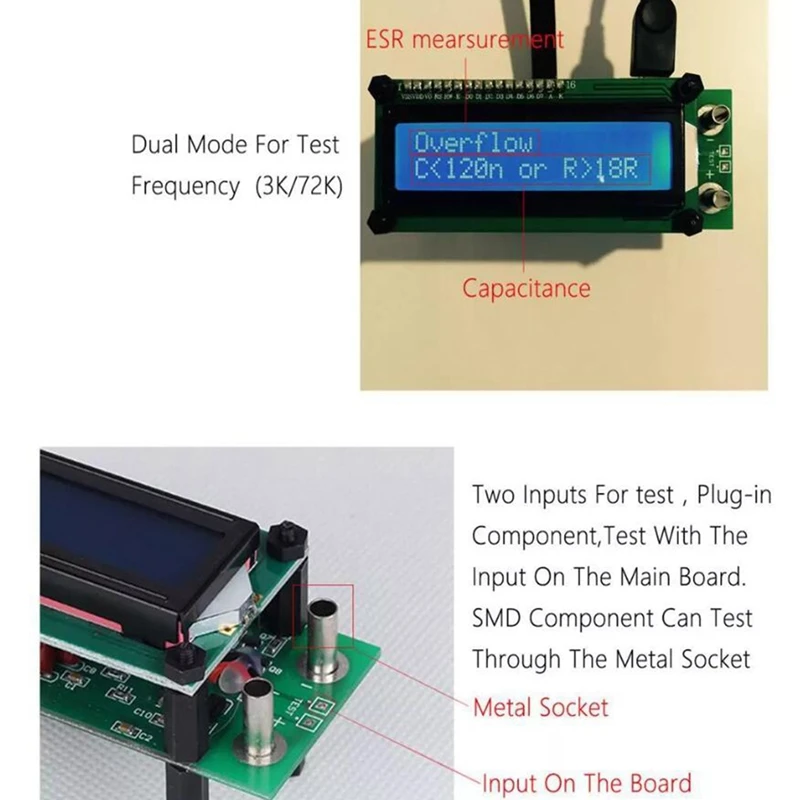 Двойной режим для источника питания: аккумулятор 9 В/6F22 или источник питания USB (Универсальный адаптер питания 5 в постоянного тока)Двойной режим для тестовой частоты (3K/72K): Проверьте параметры компонента с сигналом 3K/72K Hz, в то же время.Два входа для тестирования, вставной компонент, тест с входом на основной плате. Компонент SMD может тестироваться через металлАвтоматический диапазон, все функции зависят от одной кнопки переключения, просто используйте, быстрая скорость тестированияХарактеристики:Количество дисплеев: 20000Сопротивление: 0,01-20Ω точность: 0.5% + 2 разрядаЕмкость ESR: 0.01-20Ω, требуется для значения лагера, чем 0,1 мкФ точность: 1% + 2 цифрыЕмкость: 0,1 мкФ-1000 мкФ, (3 мкФ-1000 мкФ, тест с сигналом 3K Hz, 0,1 мкФ-3 мкФ, тест с сигналом 72K Hz) Точность: тест с сигналом 72kH/3kHz в то же время, может получить два значения емкости, точность составляет 2% ± 10 цифр (зависит от диапазона и Гц)Индуктивность: 0-60uH(72 кГц), 0-1200uH(3 кГц) Точность: 2% + 2 цифры, разрешение 0.01uHТесты уровня сигнала: 0,3 V RMSИндикация низкого заряда батареиЗадний светильникАвтоматическое выключениеЦвет: черныйМатериал: композитный материалПосылка:1 * ESR01 LCR метрТолько вышеуказанная посылка, другие товары не включены.Примечание: светильник и различные дисплеи могут привести к тому, что цвет товара на картинке немного отличается от реального. Допускается погрешность в измерениях +/- 1-3 см.