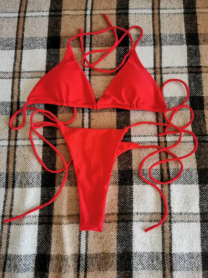 Летние сексуальные однотонные женские комплекты бикини со шнуровкой, женский купальник-стринги, Женский бандажный пляжный купальный костюм