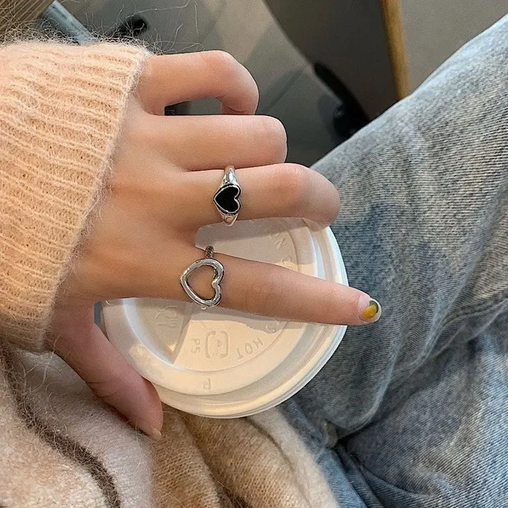 Набор колец в форме сердца для влюбленных, модные серебристые и черные кольца с полым жемчугом из сплава, для влюбленных пар, подарок на день Святого Валентина, вечеринку для женщин и девушек