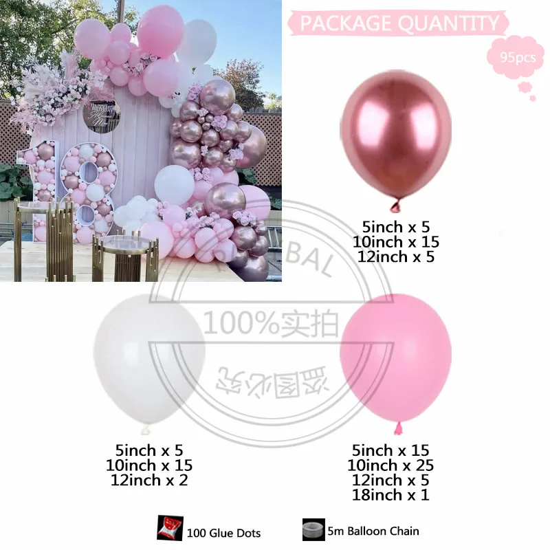 95 шт белый розовый латексный шар для свадебной вечеринки Арка гирлянда Шары Набор хромированная Роза баллон для дня рождения ребенка душ Декорации для вечеринки