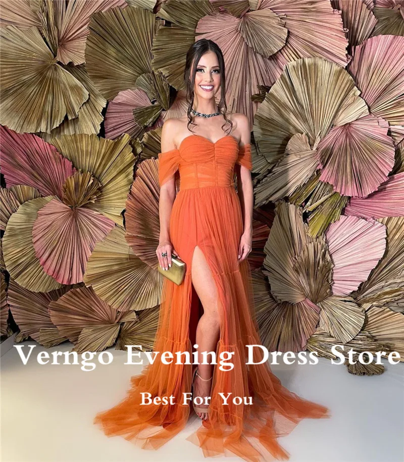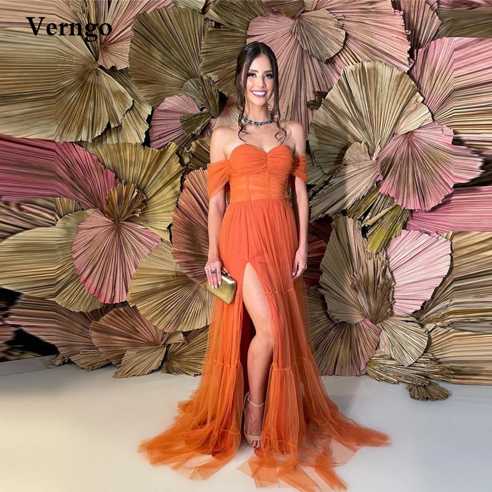 Женское длинное вечернее платье Verngo, оранжевое Тюлевое платье А-силуэта с открытыми плечами и Боковым Разрезом, юбка для выпускного вечера