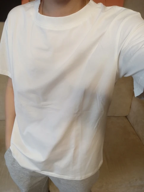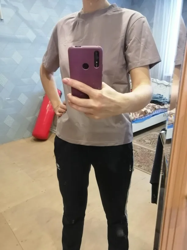 Отличная футболка. На параметры 94-74-98 взяла М, сидит отлично, чуть свободна. Качество очень хорошее