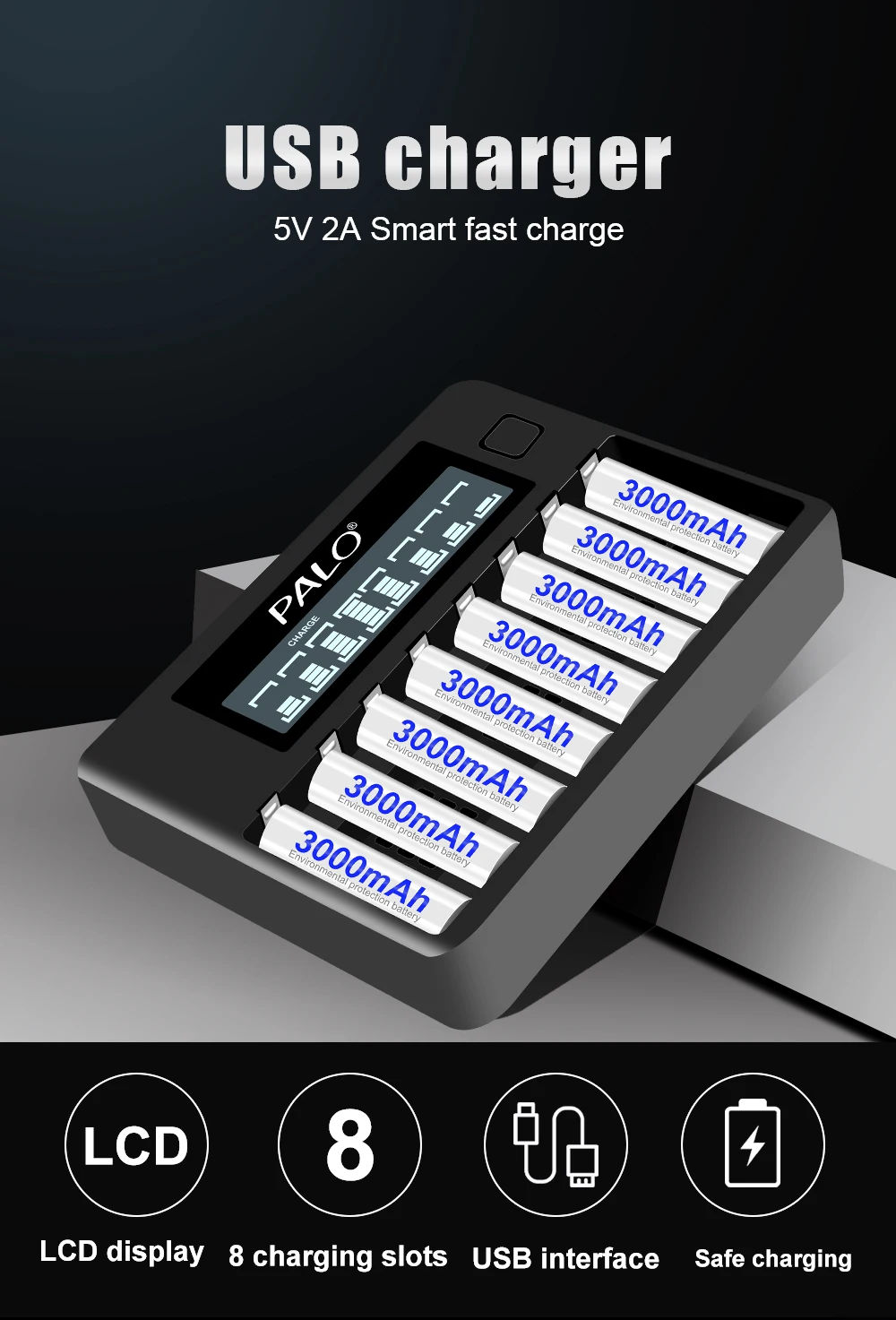 Аккумуляторная батарея PALO AA 1,2 в AA, 3000 мАч, с 8 слотами, 1,2 в, зарядное устройство aa AAA