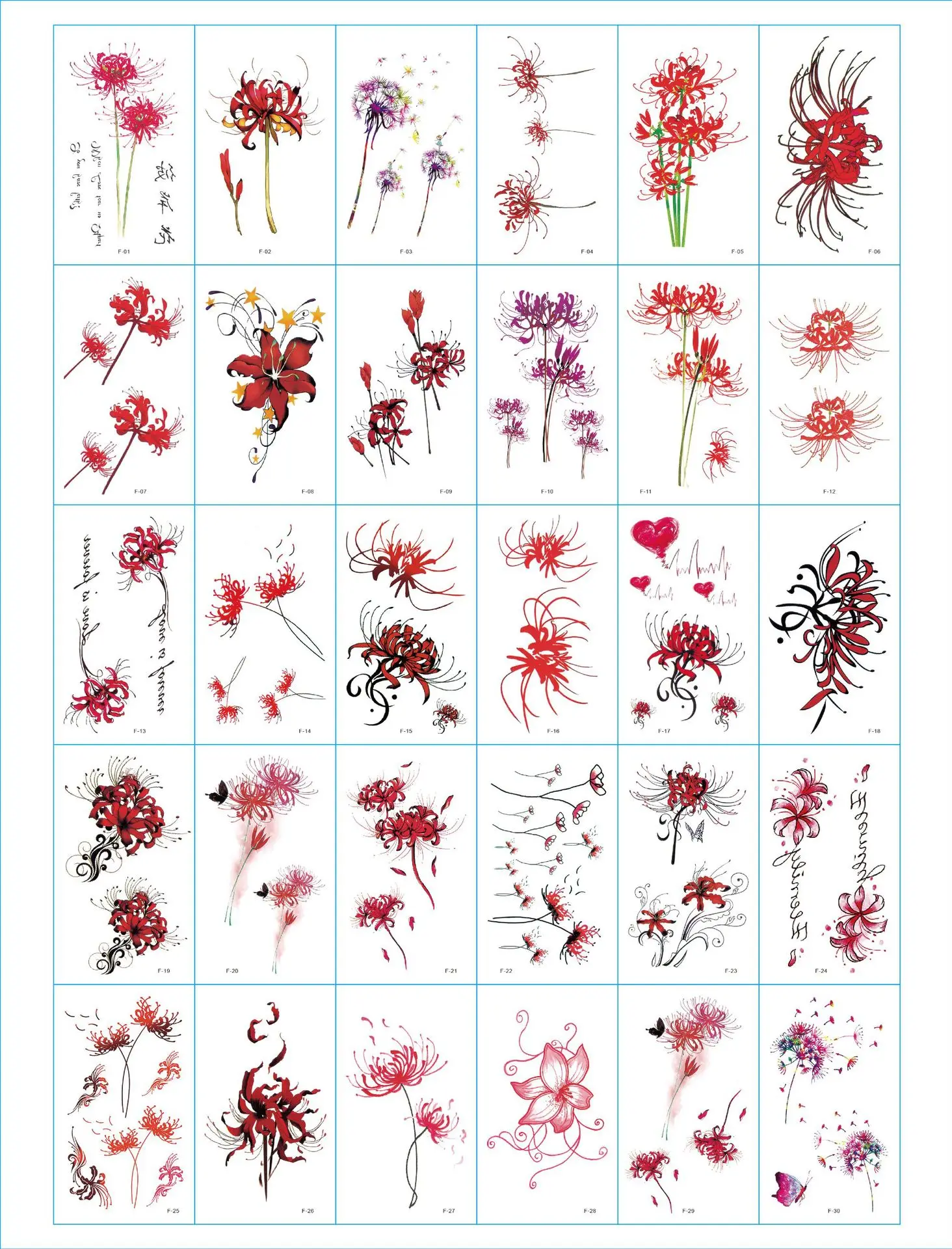 Название: Временная татуировкаКоличество: 30 листов/партияРазмеры: 9,7 см * 5,7 см/листПрактический метод:1. Вырежьте узоры, которые необходимо разместить2. Оторвите прозрачную защитную пленку на поверхности3. Нанесите наклейку (сбоку с рисунком) на кожу4. Используйте влажную ткань или губку, чтобы коснуться наклеек, пока они не намокнут5. После правильной вставки подождите 35-50 секунд, а затем высушите на воздухе и Оторвите его