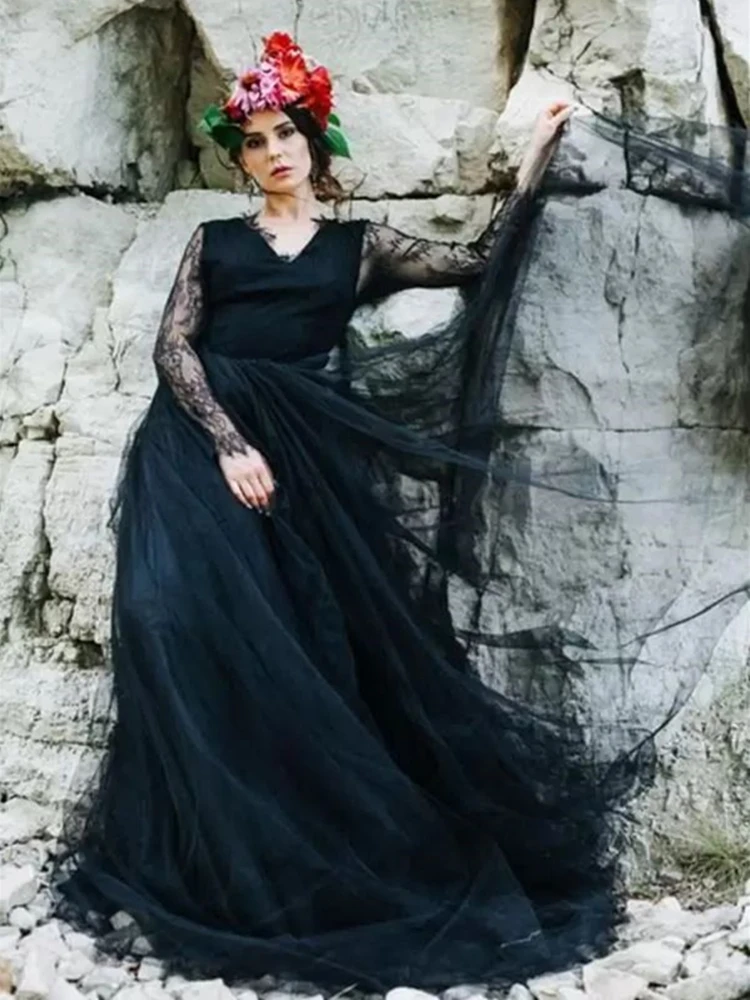 Черные кружевные Готические свадебные платья с длинным рукавом, V-образным вырезом, перекрестными бретельками, с вырезами на спине, свадебные платья на заказ