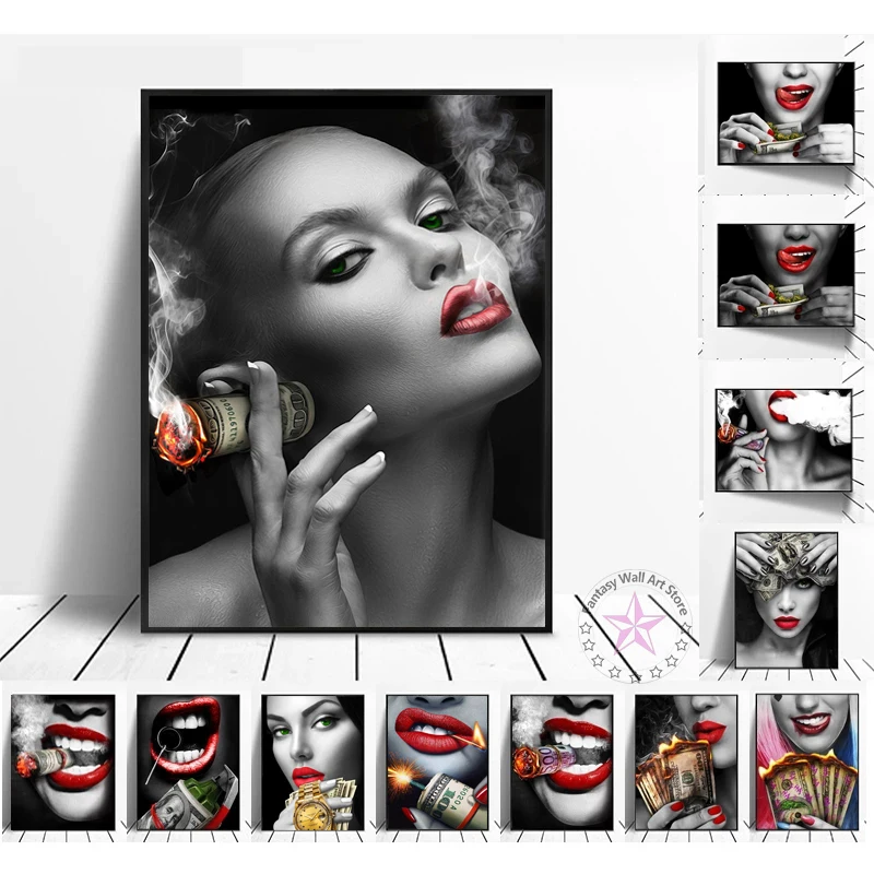 Плакат на холсте с изображением пикантных губ курительной женщины, сжигающие доллары, деньги, картина с рисунком, настенное искусство, часы, картина с пулями, украшение для дома