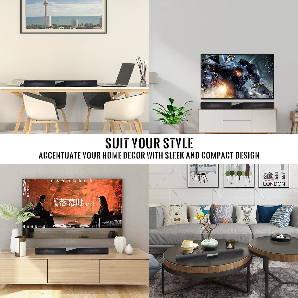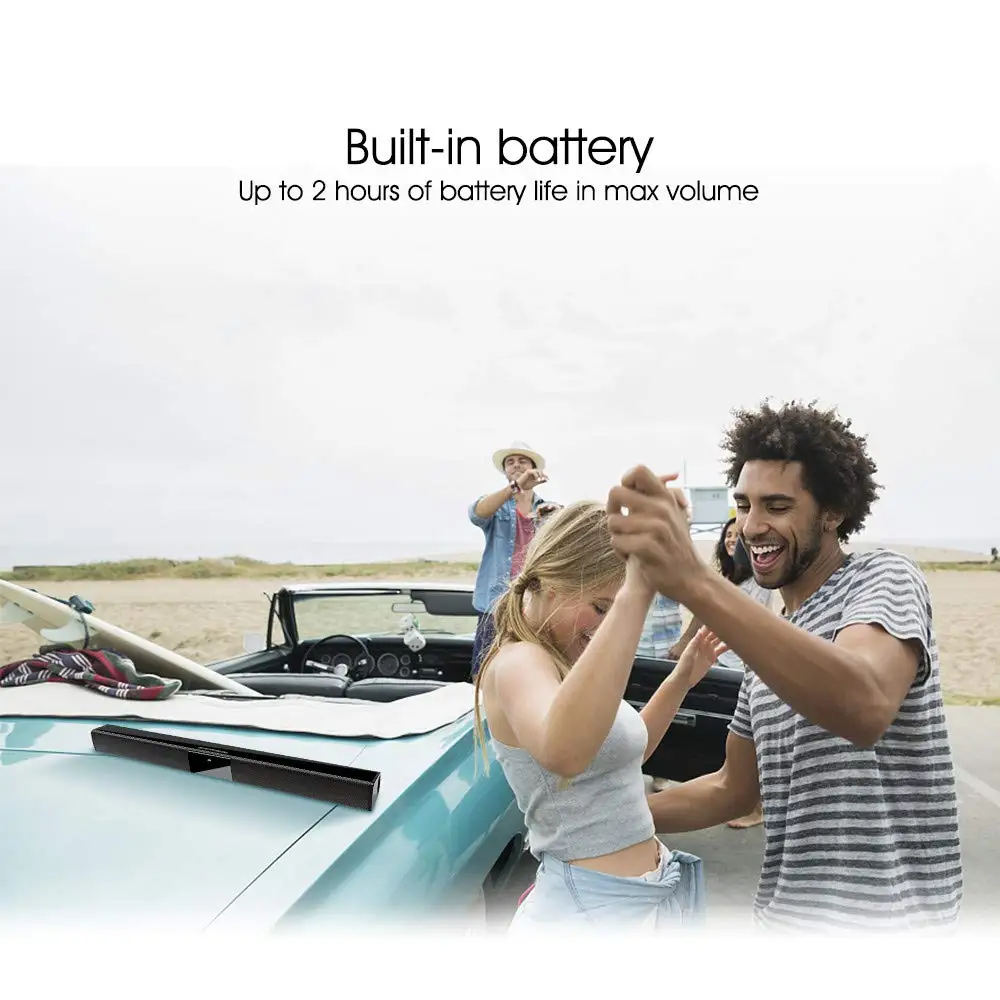 22 дюйма Длина звуковая панель с реверсивным звуковым со встроенной батареи, которая может воспроизводить музыку с погрешностью в пределах 2-х часов в режиме максимальной громкости костюмы для внутреннего и наружного использования. Подключите звуковую панель к телевизору с помощью одного из прилагаемых кабелей.