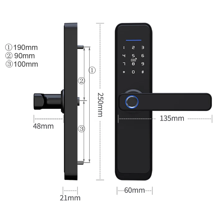 1. Приложение/отпечаток пальца/Пароль/смарт-карта/разблокировка ключа2. Просмотр журналов доступа из приложения3. Поддерживает обычный открытый режим (свободный доступ)4. Размер врезного замка5. Английский Голос6. Панель для волочения проволоки7. Матовый корпус8. Универсальные как для правой, так и для левой двери9. Подходит для 35-50 мм