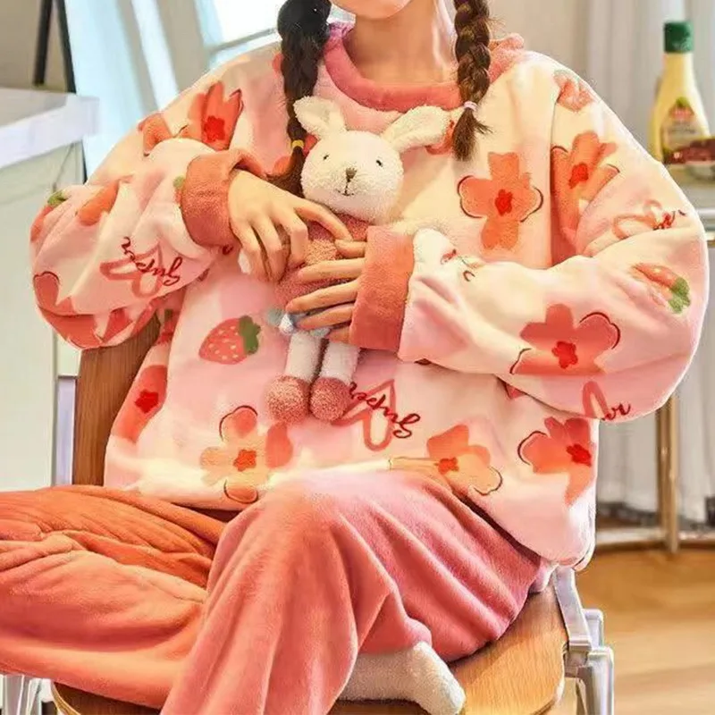 Зимняя Фланелевая пижама, пижама из кораллового флиса, Женский утепленный костюм для домашнего использования с мультяшным рисунком, бархатный зимний пижамный комплект