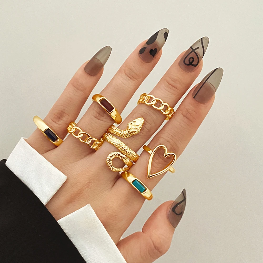 Женское Винтажное кольцо в стиле панк, Золотое кольцо на палец с широкой цепочкой и змеиным сердцем, асимметричное кольцо в богемном стиле, Подарочная бижутерия